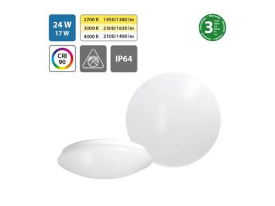 LED stropní a nástěnné svítidlo 24W bílé, 230V, IP64, 3CCT - teplá nebo neutrální bílá, max. světelný tok 1950lm/2700K, 2300lm/3000K, 2100lm/4000K, vyzařovací úhel 120°, CRI 90, životnost 100.000h, rozměry ø360x92mm, materiál plech/plast, mléčný difuzor, nestmívatelné, PF>0,9, s přepínači výkonu 24/17W a teploty chromatičnosti 2700/3000/4000K