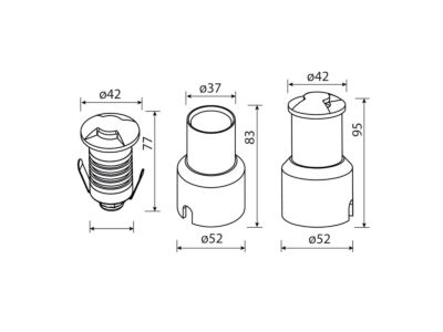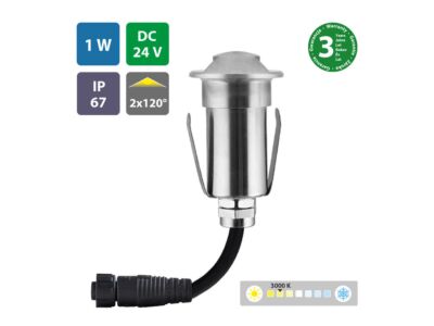 Zemní svítidlo, kryt z nerez oceli 304, tělo svítidla z hliníku, difuzor z mléčného tvrzeného skla, příkon světelného zdoroje 1W, DC24V (napájecí zdroj není součástí dodávky), barva světla teple bílá 3000K, 2x boční vyzařovací úhel, IP67, rozměry svítidla Ø42x77mm, kabel 2x0,75mm2 zakončený voděodolným konektorem s převlečnou maticí M12. Instalační rozměry Ø52x83mm. Záruka 24 měsíců.