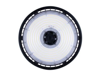 LED průmyslové svítidlo 200 W, černý, 230 V, IP65, 5000 K, světelný tok 34520 lm, vyzařovací úhel 120 °, CRI80, životnost > 50.000 h, rozměry ø 305 x 163 mm, materiál hliník/plast, stmívatelné DALI, PF>0,96.