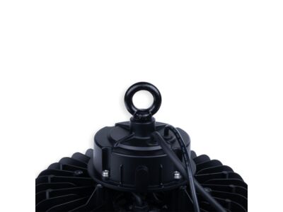 LED průmyslové svítidlo 200 W, černý, 230 V, IP65, 5000 K, světelný tok 34390 lm, vyzařovací úhel 90 °, CRI80, životnost > 50.000 h, rozměry ø 305 x 163 mm, materiál hliník/plast, stmívatelné DALI, PF>0,96.