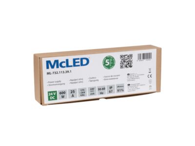 Zdroj konstantního napětí, výkon 600W, krytí IP67, výstup: 24VDC, max. 25A. Vstup: 175-264VAC, 50-60Hz, materiál krytu: hliník. Rozměry: 260x102x37mm, hmotnost: 2110g. Zdroj SELV. Při výběru zdroje počítejte s výkonovou rezervou min. 20%.