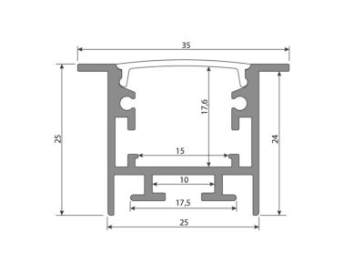 Vestavný hliníkový profil pro LED pásky, rozměry průřezu cca 35x25 mm. Součástí je čirý difuzor, který lze do profilu nacvaknout. Tento profil je určen pro krytí a chlazení LED pásků do šíře 15 mm. Upevnění k podkladu lze provést pomocí montážních úchytů, vrutů, lepidel. K profilu lze zakoupit úchyty a koncovky.