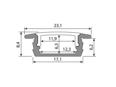 Vestavný hliníkový profil pro LED pásky, rozměry průřezu cca 23x8 mm. Součástí je matný difuzor, který lze do profilu nacvaknout. Tento profil je určen pro krytí a chlazení LED pásků do šíře 12 mm. Upevnění k podkladu lze provést pomocí vrutů, lepidel. K profilu lze zakoupit koncovky.