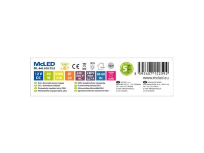 Stmívatelný napěťový zdroj pro LED pásky - výkon 40W, výstupní napětí DC 12V, proud max. 3,35A. IP20. Vstupní napětí 200 - 240V AC, materiál krytu: plast. Rozměry 185x42,5x28,5mm, hmotnost 161g. Stmívání pomocí DALI nebo tlačítkem. Při výběru zdroje počítejte s výkonovou rezervou min. 20%. Doba náběhu cca 0,5 - 2s. Certifikace: CE, ENEC, SELV, F, MM.