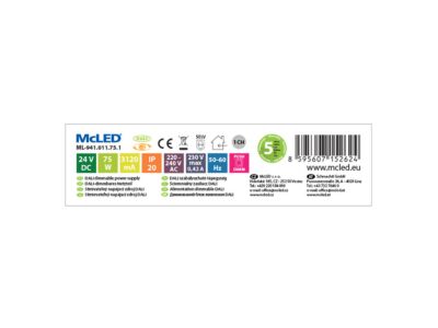 Stmívatelný napěťový zdroj pro LED pásky - výkon 75W, výstupní napětí DC 24V, proud max. 3,12A. IP20. Vstupní napětí 200 - 240V AC, materiál krytu: plast. Rozměry 295x40x32mm, hmotnost 340g. Stmívání pomocí DALI nebo tlačítkem. Při výběru zdroje počítejte s výkonovou rezervou min. 20%. Doba náběhu cca 0,5 - 2s. Certifikace: CE, ENEC, SELV, F, MM.