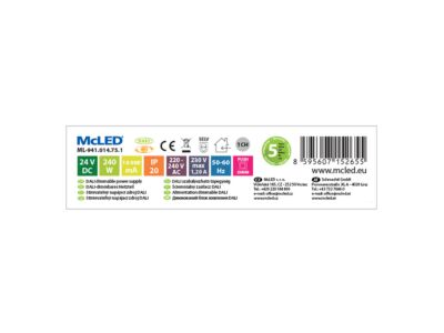 Stmívatelný napěťový zdroj pro LED pásky - výkon 240W, výstupní napětí DC 24V, proud max. 10A. IP20. Vstupní napětí 200 - 240V AC, materiál krytu: plast. Rozměry 360x40x32mm, hmotnost 730g. Stmívání pomocí DALI nebo tlačítkem. Při výběru zdroje počítejte s výkonovou rezervou min. 20%. Doba náběhu cca 0,5 - 2s. Certifikace: CE, ENEC, SELV, F, MM.