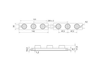 LED modul 3E3 6 W, 12-24 V, 3x LED, IP65, 6500 K-studená bílá, světelný tok 780 lm, vyzařovací úhel 10 °x 40 °, Ra>75, životnost až 50.000 h+, rozměry 142 x 30 x 17,5, materiál plast, stmívatelné