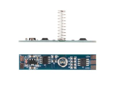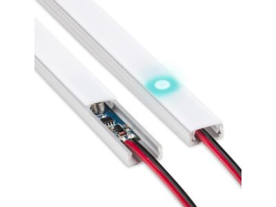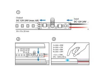 Stmívač LED pásku k montáži do hliníkových profilů. Napájecí napětí: 12/24V, celkový max. proud: 6A (4A/kanál), rozměry 50x10x20mm (pružina lze zkrátit). Stmívač je opatřený modrou LED, která svítí na difuzor AL profilu. Krátkým dotykem v nasvíceném prostoru se přepne: WW/NW/CW/vypnuto, podržením lze stmívat v intervalu 5-100% max. hodnoty jasu. Pamatuje si poslední nastavenou hodnotu (i po odpojení napájení).