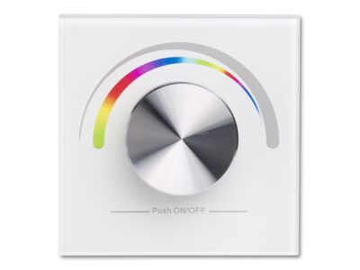 RF dálkový otočný ovladač pro řízení jasu a barevných režimů RGB LED pásků umožňuje řízení jedné skupiny RF přijímačů (nejsou součástí), tato skupina může mít neomezeně přijímačů. Instalace do elektroinstalační krabice pomocí vrutů (součástí). Rozsah stmívání 1 - 100 %. Rozměry ovladače: 86×86×41,6mm, napájení 1x CR2430 baterie (součástí), dosah cca 20m.