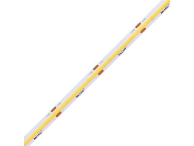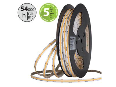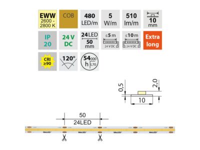 Stmívatelný LED pásek COB, extra teplá bílá (2700 K), 5 W, 480 LED, 510 lm/m, CRI>90, segment 50 mm, 24 LED/segment, IP20, DC 24 V, životnost 54000 h, šíře 10 mm, bílý PCB pásek, max. délka pásku při jednostranném zapojení: 15 m, opatřen samolepící páskou 3M, UV stabilní. Balení 50 m.