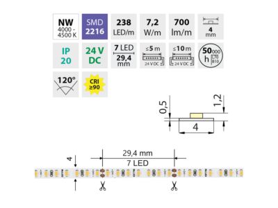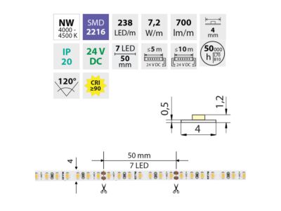 LED pásek SMD2216, neutrální bílá (4200K), 7,2W, 238LED, 700lm/m, CRI90, segment 29,4mm, 7LED/segment, IP20, DC 24V, životnost 50000h, šíře 4mm, bílý PCB pásek, max. délka pásku při jednostranném zapojení: 5m, opatřen samolepící páskou 3M, UV stabilní. Balení 5m.