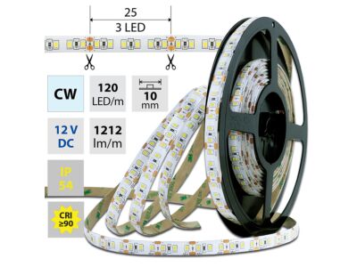 LED pásek SMD2835, 5600-6200K (studeně bílý CW), 14W, 120LED, 1365lm/m, segment 50mm, 3LED/segment, IP54, DC 12V, životnost 54000h, šíře 10mm, bílý PCB pásek, max. délka pásku při jednostranném zapojení: 5m, opatřen samolepící páskou 3M, UV stabilní. Balení 5m.