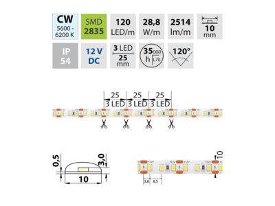 LED pásek SMD2835, studená bílá (6000K), 28,8W, 120LED, 2514lm/m, segment 25mm, 3LED/segment, IP54, DC 12V, životnost 54000h, šíře 10mm, bílý PCB pásek, max. délka pásku při jednostranném zapojení: 5m, opatřen samolepící páskou 3M, UV stabilní.