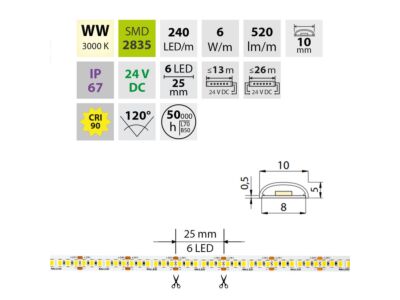 Stmívatelný LED pásek SMD2835, studená bílá (6000K), 6W, 240LED, 520lm/m, CRI>90, segment 25mm, 6LED/segment, IP67, DC 24V, životnost 50000h, šíře 10mm, bílý PCB pásek, max. délka pásku při jednostranném zapojení: 13m, opatřen samolepící páskou 3M, UV stabilní. Balení 50m.