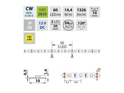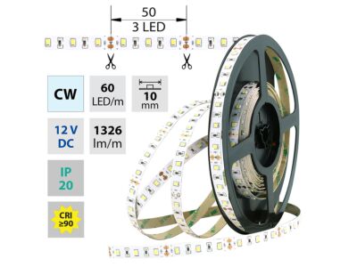 LED pásek SMD2835, studená bílá (6000K), 14,4W, 60LED, 1410lm/m, segment 50mm, 3LED/segment, IP20, DC 12V, životnost 54000h, šíře 10mm, bílý PCB pásek, max. délka pásku při jednostranném zapojení: 5m, opatřen samolepící páskou 3M, UV stabilní.