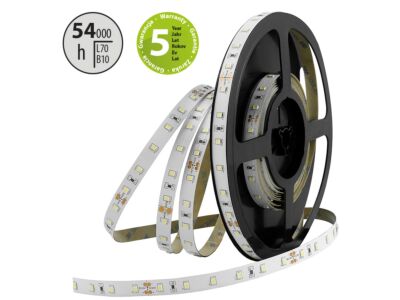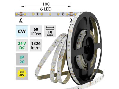 LED pásek SMD2835, studená bílá (6000K), 14,4W, 60LED, 1410lm/m, segment 100mm, 6LED/segment, IP20, DC 24V, životnost 54000h, šíře 10mm, bílý PCB pásek, max. délka pásku při jednostranném zapojení: 5m, opatřen samolepící páskou 3M, UV stabilní.