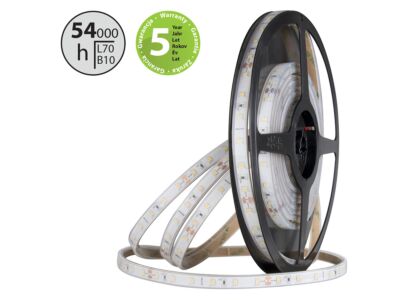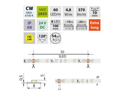LED pásek SMD2835, studená bílá (6000K), 4,8W, 60LED, 370lm/m, CRI>90, segment 100mm, 6LED/segment, IP68, DC 24V, životnost 54000h, šíře 10mm, bílý PCB pásek, max. délka pásku při jednostranném zapojení: 10m, opatřen samolepící páskou 3M, UV stabilní. Balení 5m.