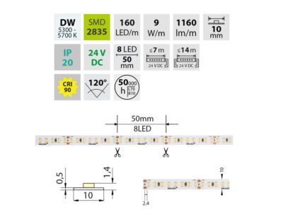 LED pásek SMD2835, denní bílá (5500K), 9W, 160LED, 1160lm/m, CRI>90, segment 50mm, 8LED/segment, IP20, DC 24V, životnost 50000h, šíře 10mm, bílý PCB pásek, max. délka pásku při jednostranném zapojení: 7m, opatřen samolepící páskou 3M, UV stabilní. Balení 50m.