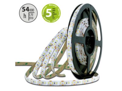 LED pásek SMD2835, extra teplá bílá (2700K), 14W, 120LED, 1120lm/m, CRI>90, segment 25mm, 3LED/segment, IP20, DC 24V, životnost 54000h, šíře 10mm, bílý PCB pásek, max. délka pásku při jednostranném zapojení: 5m, opatřen samolepící páskou 3M, UV stabilní. Délka 50m.