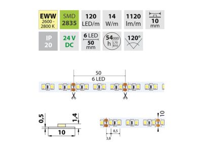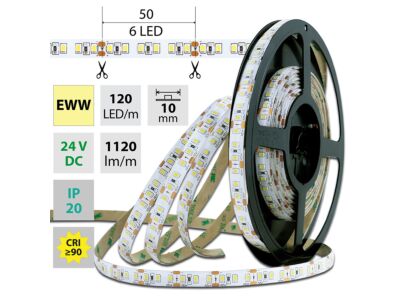 LED pásek SMD2835, extra teple bílá EWW (2700K), 14W, 120LED, 1120lm/m, segment 50mm, 6LED/segment, IP20, DC 24V, životnost 54000h, šíře 10mm, bílý PCB pásek, max. délka pásku při jednostranném zapojení: 8m, opatřen samolepící páskou 3M, UV stabilní. Balení 5m.