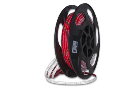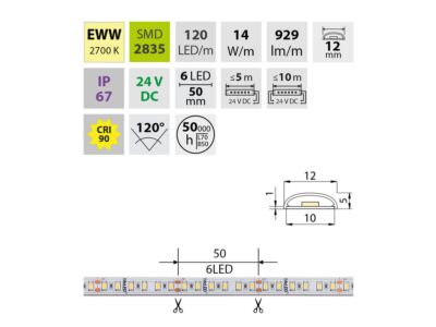 LED pásek SMD2835, extra teplá bílá (2700K), 14W, 120LED, 929lm/m, CRI>90, segment 50mm, 6LED/segment, IP67, DC 24V, životnost 50000h, šíře 12mm, bílý PCB pásek, max. délka pásku při jednostranném zapojení: 5m, opatřen samolepící páskou 3M, UV stabilní. Balení 50m.
