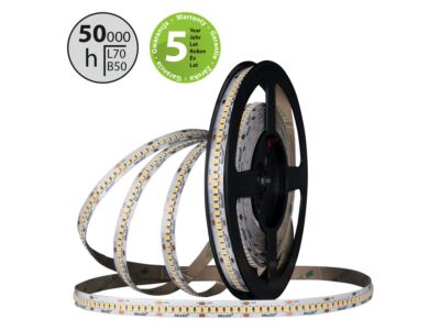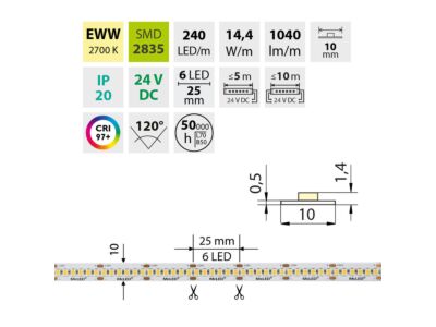 LED pásek SMD2835, extra teple bílá (2700K), 14,4W, 240LED, 1040lm/m, CRI97, segment 25mm, 6LED/segment, IP20, DC 24V, životnost 50000h, šíře 10mm, bílý PCB pásek, max. délka pásku při jednostranném zapojení: 5m, opatřen samolepící páskou 3M, UV stabilní. Balení 50m.