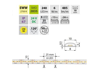 LED pásek SMD2835, extra teplá bílá (2700K), 6W, 240LED, 485lm/m, CRI>90, segment 25mm, 6LED/segment, IP67, DC 24V, životnost 50000h, šíře 10mm, bílý PCB pásek, max. délka pásku při jednostranném zapojení: 13m, opatřen samolepící páskou 3M, UV stabilní. Balení 5m.