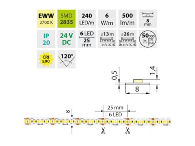 MCLED Pásek LED SMD2835 EWW, 240LED/m, 6W/m, DC 24V, 500lm/m, CRI90, IP20, 8mm, 50m