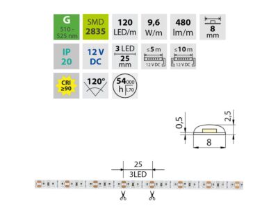 LED pásek SMD2835, zelený G, 9,6W, 120LED, 480lm/m, CRI>90, segment 25mm, 3LED/segment, IP20, DC 12V, životnost 54000h, šíře 8mm, bílý PCB pásek, max. délka pásku při jednostranném zapojení: 5m, opatřen samolepící páskou 3M, UV stabilní. Balení 50m.