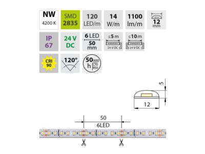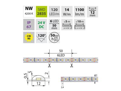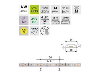 LED pásek SMD2835, neutrální bílá (4200K), 14W, 120LED, 1100lm/m, CRI>90, segment 50mm, 6LED/segment, IP67, DC 24V, životnost 50000h, šíře 12mm, bílý PCB pásek, max. délka pásku při jednostranném zapojení: 5m, opatřen samolepící páskou 3M, UV stabilní. Balení 50m.