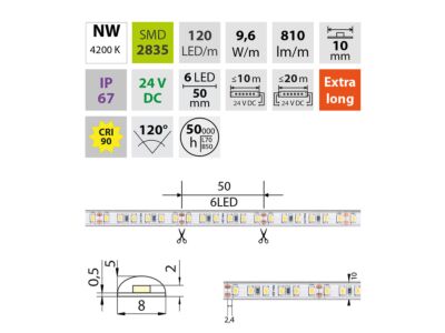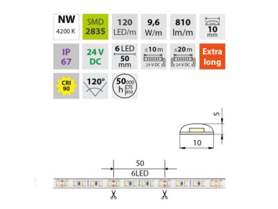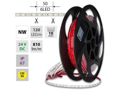 LED pásek SMD2835, neutrálně bílá (4200K), 9,6W, 120LED, 810lm/m, CRI>90, segment 50mm, 6LED/segment, IP67, DC 24V, životnost 50000h, šíře 10mm, bílý PCB pásek, max. délka pásku při jednostranném zapojení: 8m, opatřen samolepící páskou 3M, UV stabilní. Balení 50m.