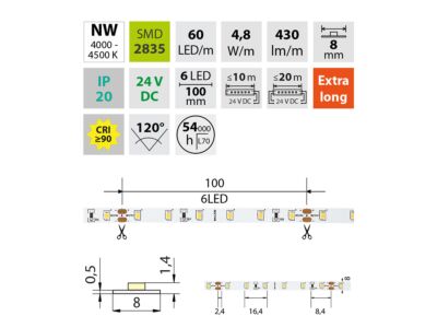 LED pásek SMD2835, neutrální bílá (4200K), 4,8W, 60LED, 430lm/m, CRI>90, segment 100mm, 6LED/segment, IP20, DC 24V, životnost 54000h, šíře 8mm, bílý PCB pásek, max. délka pásku při jednostranném zapojení: 10m, opatřen samolepící páskou 3M, UV stabilní. Balení 50m.