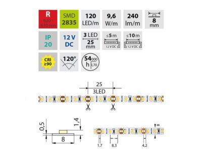 LED pásek SMD2835, červený R, 9,6W, 120LED, 240lm/m, CRI>90, segment 25mm, 3LED/segment, IP20, DC 12V, životnost 54000h, šíře 8mm, bílý PCB pásek, max. délka pásku při jednostranném zapojení: 5m, opatřen samolepící páskou 3M, UV stabilní. Balení 5m.