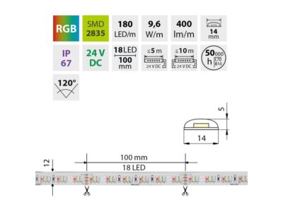 LED pásek do sauny SMD2835, barevný RGB, 9,6W, 180LED, 400lm/m, segment 100mm, 18LED/segment, IP67, DC 24V, životnost 50000h, šíře 14mm, bílý PCB pásek, max. délka pásku při jednostranném zapojení: 5m, opatřen samolepící páskou 3M, UV stabilní, pro teploty max. 100 °C. Balení 5m.