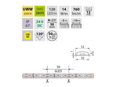LED pásek SMD2835, ultra teplá bílá (2000K), 14W, 120LED, 760lm/m, CRI>90, segment 50mm, 6LED/segment, IP67, DC 24V, životnost 50000h, šíře 12mm, bílý PCB pásek, max. délka pásku při jednostranném zapojení: 5m, opatřen samolepící páskou 3M, UV stabilní. Balení 50m.