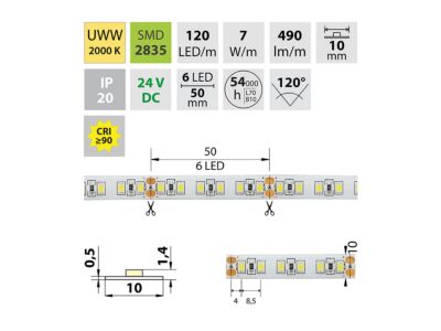 LED pásek SMD2835, ultra teplá bílá (2000K), 7W, 120LED, 490lm/m, segment 50mm, 6LED/segment, IP20, DC 24V, životnost 54000h, šíře 10mm, bílý PCB pásek, max. délka pásku při jednostranném zapojení: 10m, opatřen samolepící páskou 3M, UV stabilní. Délka v balení: 50m.