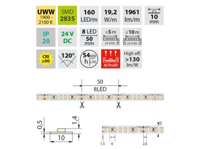 Stmívatelný LED pásek SMD2835, ultra teplá bílá (2000K), 19,2W, 160LED, 2212lm/m, CRI>90, segment 50mm, 8LED/segment, IP20, DC 24V, životnost 54000h, šíře 10mm, bílý PCB pásek, max. délka pásku při jednostranném zapojení: 5m, opatřen samolepící páskou 3M, UV stabilní. Balení 5m.