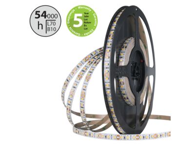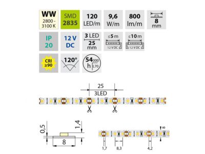 LED pásek SMD2835, teplá bílá (3000K), 9,6W, 120LED, 900lm/m, CRI>90, segment 25mm, 3LED/segment, IP20, DC 12V, životnost 54000h, šíře 8mm, bílý PCB pásek, max. délka pásku při jednostranném zapojení: 5m, opatřen samolepící páskou 3M, UV stabilní. Balení 50m.