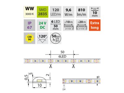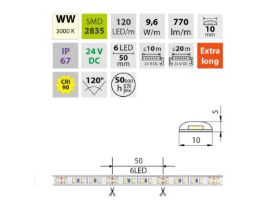 LED pásek SMD2835, teplá bílá (3000K), 9,6W, 120LED, 770lm/m, CRI>90, segment 50mm, 6LED/segment, IP67, DC 24V, životnost 50000h, šíře 10mm, bílý PCB pásek, max. délka pásku při jednostranném zapojení: 8m, opatřen samolepící páskou 3M, UV stabilní. Balení 50m.