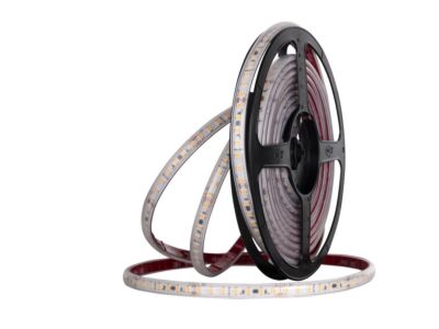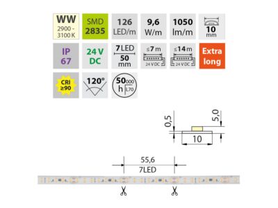 LED pásek do sauny SMD2835, teplá bílá WW (3000K), 9,6W, 120LED, 1050lm/m, segment 55,556mm, 7LED/segment, IP67, DC 24V, životnost 50000h, šíře 10mm, bílý PCB pásek, max. délka pásku při jednostranném zapojení: 7m, opatřen samolepící páskou 3M, UV stabilní, pro teploty max. 105 °C. Balení 5m.