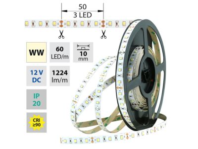 LED pásek SMD2835, 2800-3100K (teple bílý WW), 14,4W, 60LED, 1224lm/m, segment 50mm, 3LED/segment, IP20, DC 12V, životnost 54000h, šíře 10mm, bílý PCB pásek, max. délka pásku při jednostranném zapojení: 5m, opatřen samolepící páskou 3M, UV stabilní.