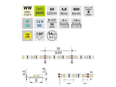 LED pásek SMD2835, teplá bílá (3000K), 4,8W, 60LED, 400lm/m, CRI>90, segment 50mm, 3LED/segment, IP20, DC 12V, životnost 54000h, šíře 8mm, bílý PCB pásek, max. délka pásku při jednostranném zapojení: 5m, opatřen samolepící páskou 3M, UV stabilní. Balení 50m.