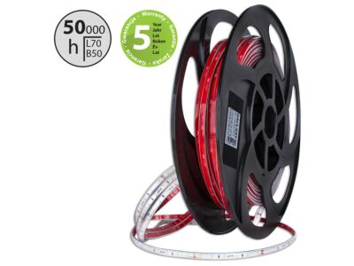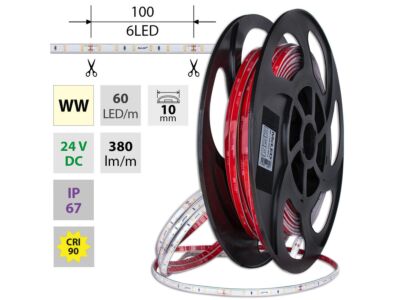 LED pásek SMD2835, teplá bílá (3000K), 4,8W, 60LED, 380lm/m, CRI>90, segment 100mm, 6LED/segment, IP67, DC 24V, životnost 50000h, šíře 10mm, bílý PCB pásek, max. délka pásku při jednostranném zapojení: 10m, opatřen samolepící páskou 3M, UV stabilní. Balení 50m.
