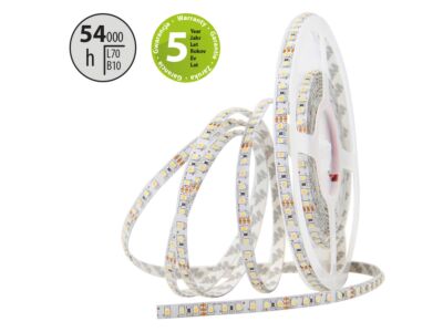 Stmívatelný LED pásek SMD3528, dual white EWW-CW (2700K+6000K), 9,6W, 120LED, 720lm/m, segment 50mm, 6LED/segment, IP20, DC 12V, životnost 54000h, šíře 8mm, bílý PCB pásek, max. délka pásku při jednostranném zapojení: 5m, opatřen samolepící páskou 3M, UV stabilní. Na pásku se střídají LED studené a teple bílé. Balení 50m.