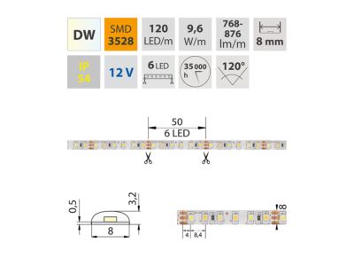 MCLED Pásek LED SMD3528 dual white WW-CW, 120LED/m, 9,6W/m, 676lm/m, IP54, DC 12V, 8mm, 5m