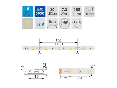 LED pásek SMD5050, modrá (465nm), 7,2W, 30LED, 185lm/m, segment 100mm, 3LED/segment, IP54, DC 12V, životnost 54000h, šíře 10mm, bílý PCB pásek, max. délka pásku při jednostranném zapojení: 5m, opatřen samolepící páskou 3M.