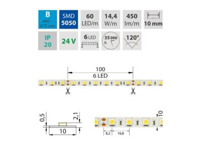 LED pásek SMD5050, modrá (465nm), 14,4W, 60LED, 450lm, segment 100mm, 6LED/segment, IP20, DC 24V, životnost 54000h, šíře 10mm, bílý PCB pásek, max. délka pásku při jednostranném zapojení: 7m, opatřen samolepící páskou 3M. Délka pásku v balení: 50m.