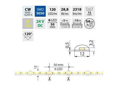 LED pásek SMD5050, studená bílá (6000K), 28,8W, 120LED, 2318lm/m, segment 50mm, 6LED/segment, IP54, DC 24V, životnost 54000h, šíře 12mm, bílý PCB pásek, max. délka pásku při jednostranném zapojení: 5m, opatřen samolepící páskou 3M, UV stabilní.