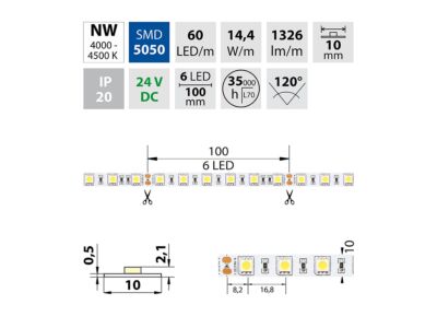 LED pásek SMD5050, neutrálně bílá (4200K), 14,4W, 60LED, 1296lm/m, segment 100mm, 6LED/segment, IP20, DC 24V, životnost 54000h, šíře 10mm, bílý PCB pásek, max. délka pásku při jednostranném zapojení: 7m, opatřen samolepící páskou 3M, UV stabilní.