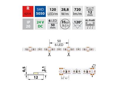 LED pásek SMD5050, červená (625nm), 28,8W, 120LED, 720lm/m, segment 50mm, 6LED/segment, IP20, DC 24V, životnost 54000h, šíře 12mm, bílý PCB pásek, max. délka pásku při jednostranném zapojení: 5m, opatřen samolepící páskou 3M, UV stabilní. Balení 50m.